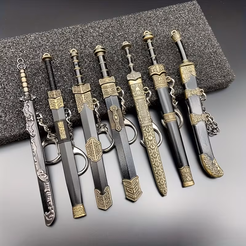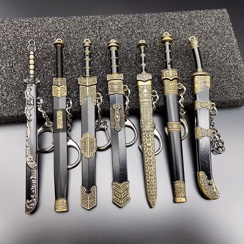 7pcs Miniature Metal Swords Set, price is for individual sword piece ($7.95 per sword), Ancient-Inspired Toy Pendant Collection, Military Theme, Durable Metal Construction, Ideal Gift For Game & Anime Enthusiasts, Ages 14+ (Sheath Included, No Display) buy the entire set for $32.95.